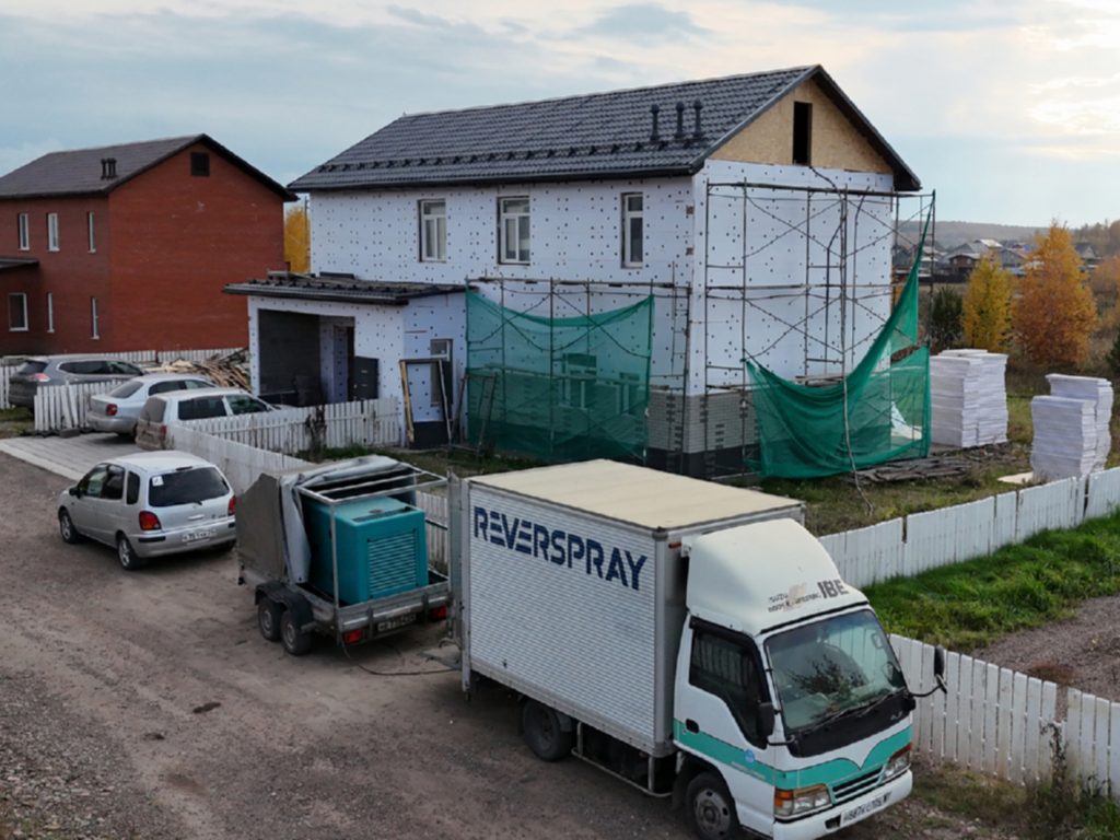 Как происходит рабочий процесс. На объект приезжает грузовой фургон, в котором установлено оборудование и находятся компоненты. Обычно компоненты поставляются в бочках по 200л. Из автомобиля, к месту работ, протягивается шланг с пистолетом распылителем. Аппарат, с помощью насосов, забирает компоненты из бочек, нагревает их и под высоким давлением подает через шланги к пистолету-распылителю. Компоненты смешиваются непосредственно перед самым выходом из пистолета, в специальной камере смешивания, после чего компоненты в жидком виде наносятся методом распыления, на утепляемую поверхность. Через 2-3 секунды происходит реакция вспенивания и материал увеличиваются в объеме. Еще через несколько секунд пена начинает застывать, и буквально через минуту становится плотной. Через пару минут пена способна выдерживать пешеходные нагрузки. Таким образом получается теплоизоляция, которая имеет закрытоячеистую структуру и прочие преимущества, которые позволяют ей не терять эффективность долгие годы. Подробнее про свойства пены Реверспрей, можно узнать из статей на нашем сайте.