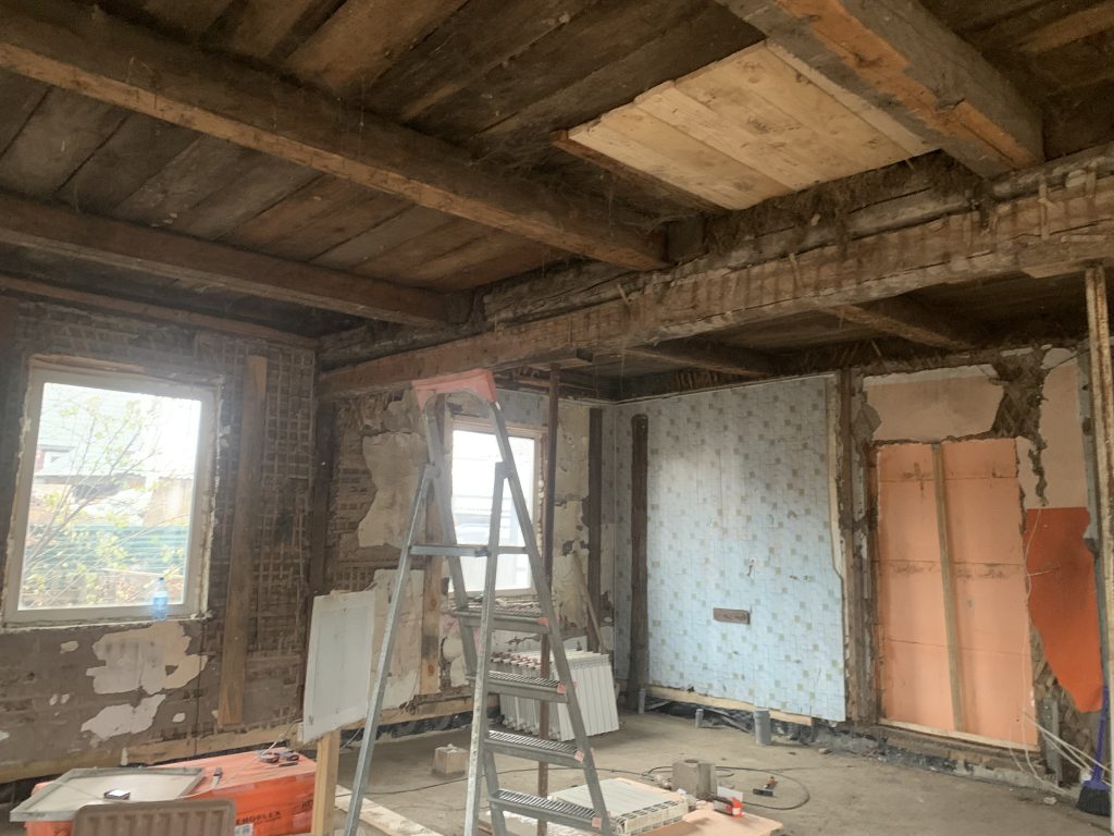 Утепляем потолочное перекрытие из черновой доски пеной Reverspray d-20. Строению очень много лет и на перекрытии сверху еще осталась насыпана смесь из