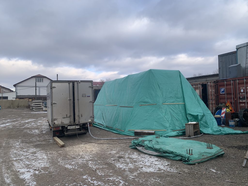 В связи с тем, что пена Reverspray наносится только при положительной температуре, для возможности утепления контейнера в уличных условиях, сделали навес из тента. Между тентом и контейнером была установлена тепловая пушка, которая достаточно быстро прогрела контейнер.