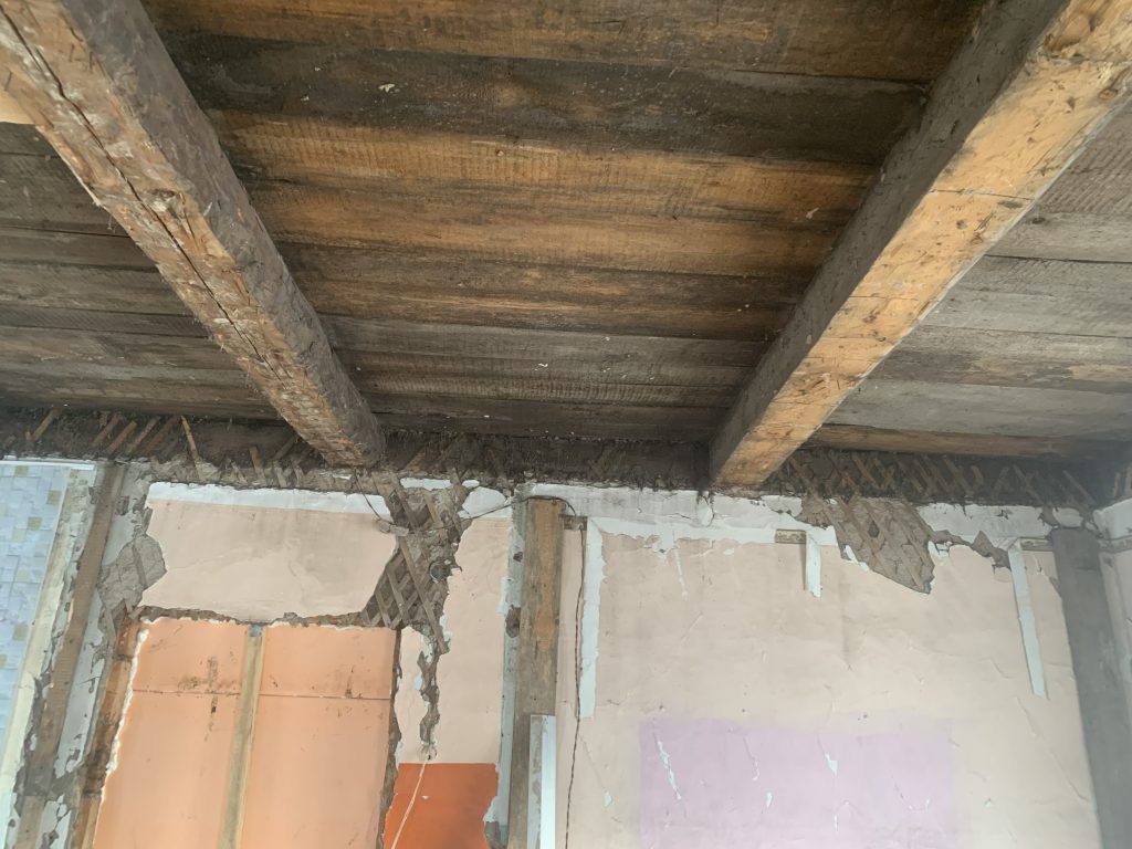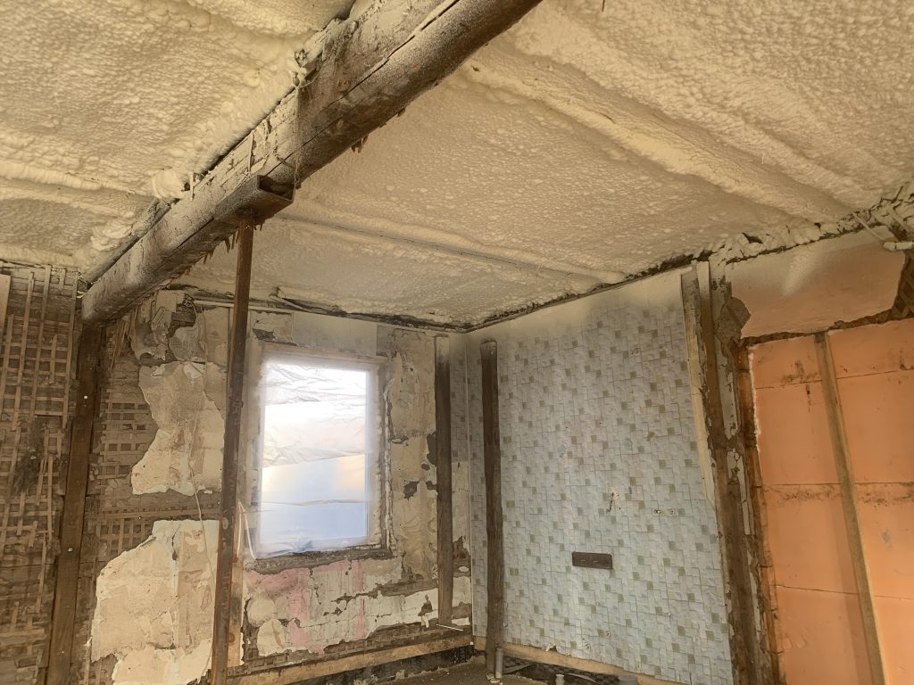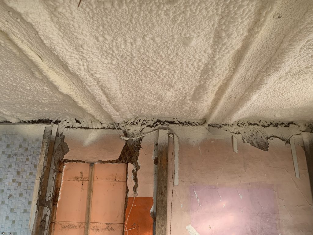 Строению очень много лет и на перекрытии сверху еще осталась насыпана смесь из опилок, земли и всяких прочих неведомых атрибутов, которые ранее применяли, что бы хоть как-то добавить конструкции тепловой защиты. Заказчик на стал связываться со всем этим и принял решение утеплить потолочное перекрытие с внутренней стороны. В связи с тем, что нам все равно, с какой стороны наносить пену, мы легко решили данный вопрос.