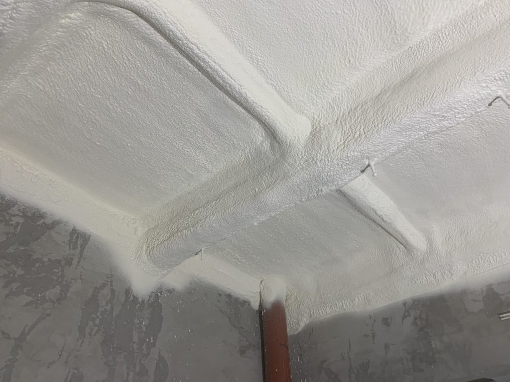 В нашем случае, при утеплении криволинейной конструкции потолка, ничего не нужно подрезать и крепить. Пена Reverspray наносится методом напыления и имеет отличную адгезию к бетонному основанию.